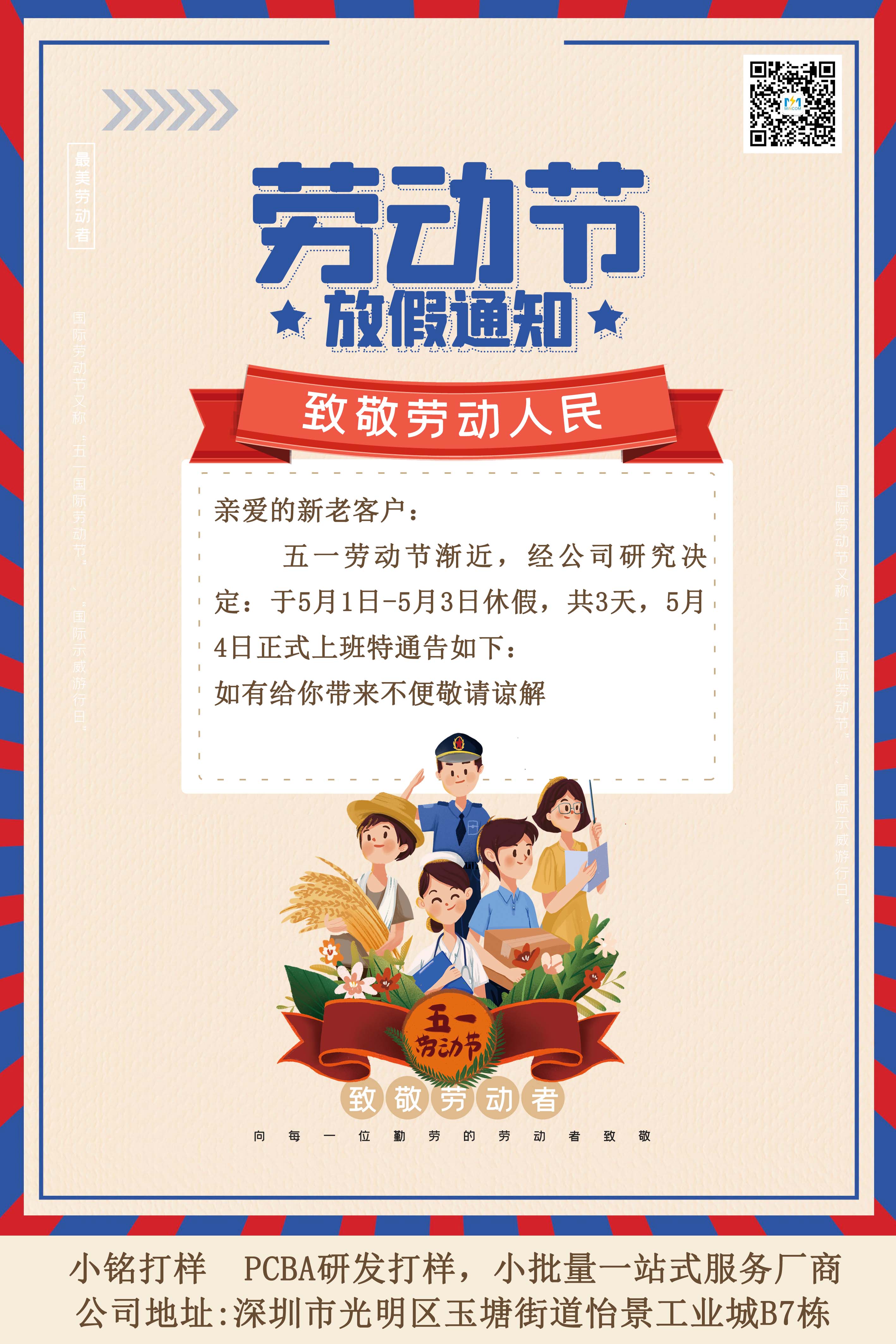 小銘打樣PCBA 五一放假通知,親愛的新老客戶: 五一勞動(dòng)節(jié)漸近,經(jīng)公司研究決定:于5月1日-5月3日休假,共3天,5月4日正式上班; 特此通告: 如有不便 敬請(qǐng)諒解!