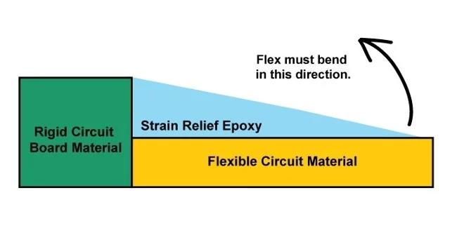 如果部件在界面處彎曲,剩余的固化樹脂可能會(huì)損壞下面的柔性層壓板。 為了保護(hù)下面的柔性層壓板, 柔性PCB設(shè)計(jì)師需要在彎曲過渡區(qū)域中的應(yīng)力消除環(huán)氧樹脂。 如下圖所示,施加的固化環(huán)氧樹脂將有助于延長(zhǎng)經(jīng)過剩余固化樹脂的彎曲區(qū)域。