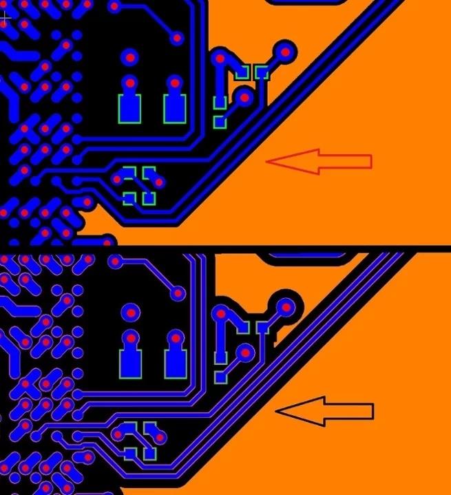 一個(gè)改進(jìn)的機(jī)會(huì)是在銅澆注和相鄰的跡線或焊盤(pán)之間使用更大的保留值。 大多數(shù)CAD布局程序?qū)⒃试S您選擇不同于基本電路布線設(shè)計(jì)規(guī)則的傾注保留值; 我們建議使用此功能非常值得。