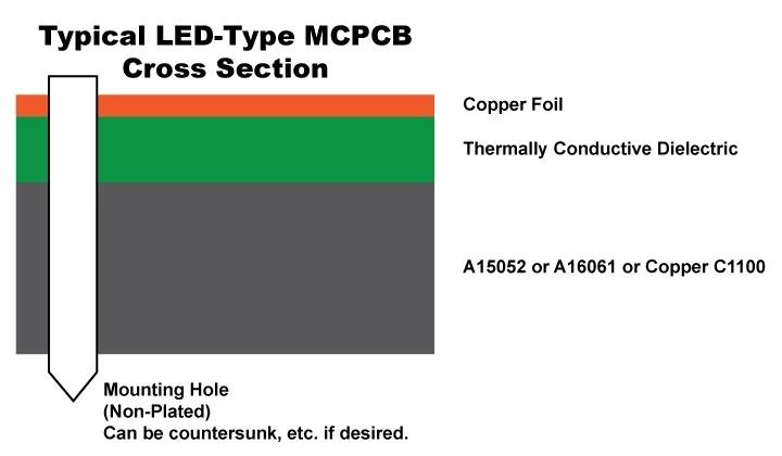 在標(biāo)準(zhǔn)PCB和MCPCB之間理解的一個重要區(qū)別是材料如何協(xié)同工作以產(chǎn)生期望的結(jié)果。 在一個典型的LED MCPCB中,有一個銅箔單層電路層,它與一層導(dǎo)熱介質(zhì)材料粘合在一起,導(dǎo)電介質(zhì)材料本身粘合到較厚的金屬層 - 通常是鋁5052,鋁6061或銅C1100。